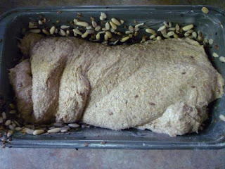Forming the dough into a loaf was done with the pastry cutter, on the counter. I didn't use any more flour on the counter, but used the stickiness of the dough to pull the dough in each of the 4 directions, one after another. Then I used Reinhart's methods of forming for the loaf pan. The tricky part was getting it into the loaf pan, since this dough is so wet. I thought that the twist I gave the dough when it landed in the pan was going to give me trouble. But I poured the seeds in the bottom of the greased pan, and over the top of the loaf, and set it to proof for an hour. Seeds I used:
