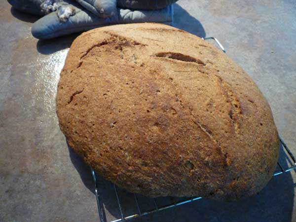 Both of these loaves retained their size and shape once baked. I did score them, and they both blew apart along the scores. I baked each for the same length of time; the one in the casserole dish had 30 minutes with lid on; I turned the one on the stone at that same time, and then baked them both for another 20 minutes at 410 degrees F.This was the bread I mostly wanted to try. I waited 24 hours before cutting into it. I chose the one baked on the stone; the other I froze, for now. The crumb of this rye bread is dense, but moist, and the crust is soft. It could have baked slightly longer, perhaps 10 minutes more. The scent is different, unlike any other sourdough I've ever baked. I wish I had words for it: it is earthy, but it reminds me of green earth. There is an herb that it smells like, a green herb, but I cannot name it. It is like a meadow after a rain. The rye taste is full, but there is an aftertaste of sour that is not unpleasant. The end result is a loaf that almost but not quite reminds me of pumpernickel. It has a kind of sweetness. This loaf is not for everybody. I like it, but my tastes are different than most, I imagine.