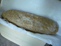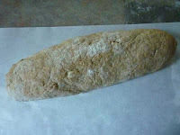 Within an hour and a half, it had risen nicely so I turned it out on the floured counter top. I didn't divide the dough, as Clayton would have us do. In stead, I formed a single big batard shape. I was fairly gentle with it, trying not to degas it too much. It is like handling a meringue.