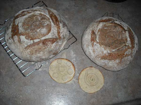 There was enough baker's dough left over for me to make a few large cookie-sized disks. This was just a trial for another idea I had -- that of making something that would leave an impression in the proofing dough. I was thinking, you could put them in the bottom of the basket and dust around them and on top of them, and it would leave a design in the final loaf, sort of like stencilling a loaf, only different.