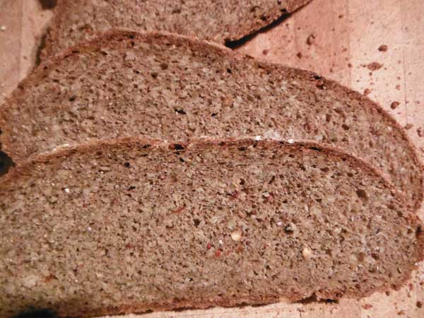 • This loaf is a good one. I don't know what it is, but the amaranth seeds and the chili powder -- both barely noticeable, but certainly they leave a trace in the tastebuds -- and perhaps the mesquite, and certainly the hemp… Quite a tasty loaf. A serendipitous loaf.